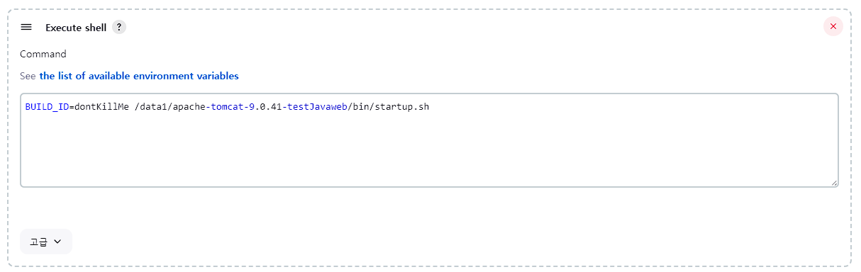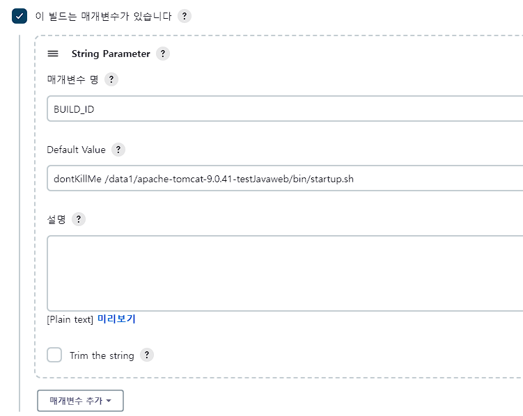 먼저 빌드에 매개변수를 추가하고 기동 명령어에 해당 명령어를 써놓는다.