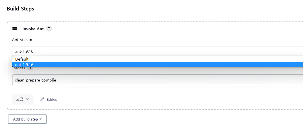 add Build Steps에서 Invoke Ant를 선택 Targets는 build.xml에 있는 target이랑 동일하다. clean prepare compile 이렇게 써도 되고 depends에 하기 전 행위를 적어놨기 때문에 compile이라고 써도 된다.