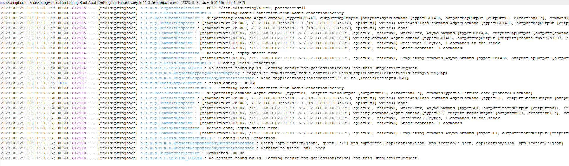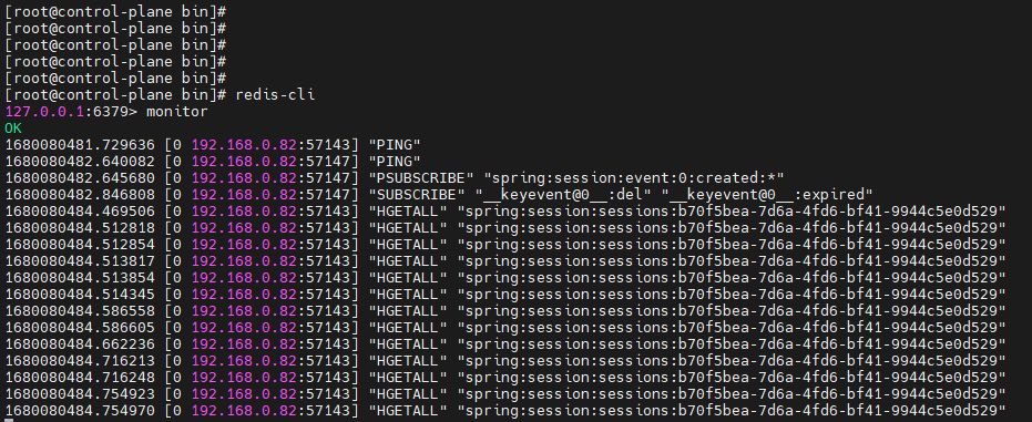 session Clustering이 잘되는지 확인을 위해 session이 redis에 저장되는지 redis-cli 명령어로 monitor(해당 redis에서 사용되는 명령어들을 모두 나옴)를 해놓고 기동한 springboot에서 하나의 서비스를 호출 해보자