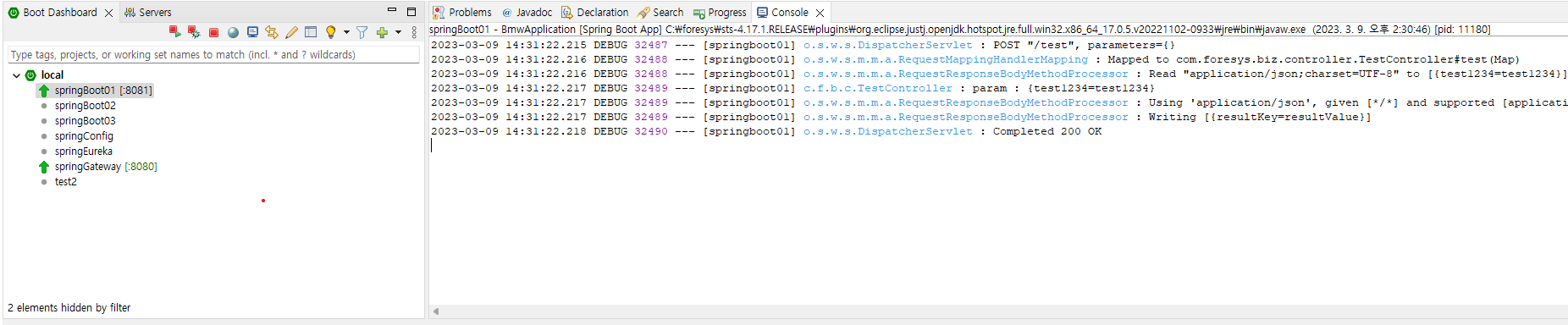 spring gateway을 호출 하면 8081 포트로 띄워진 spring boot를 호출하는 것을 볼 수 있다.